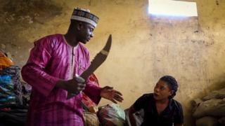 Nigeria’s drugs officers showed Ruona Meyers (right) this sword they seized from a drugs gang
