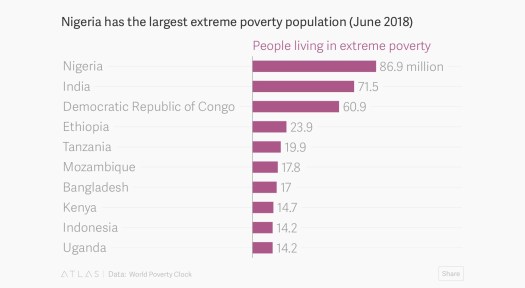 The 86.9 million Nigerians now living in extreme poverty represents nearly 50% of its estimated 180 million population. As Nigeria faces a major population boom—it will become the world’s third largest country by 2050—it’s a problem will likely worsen. But having large swathes of people still living in extreme poverty is an Africa-wide problem.