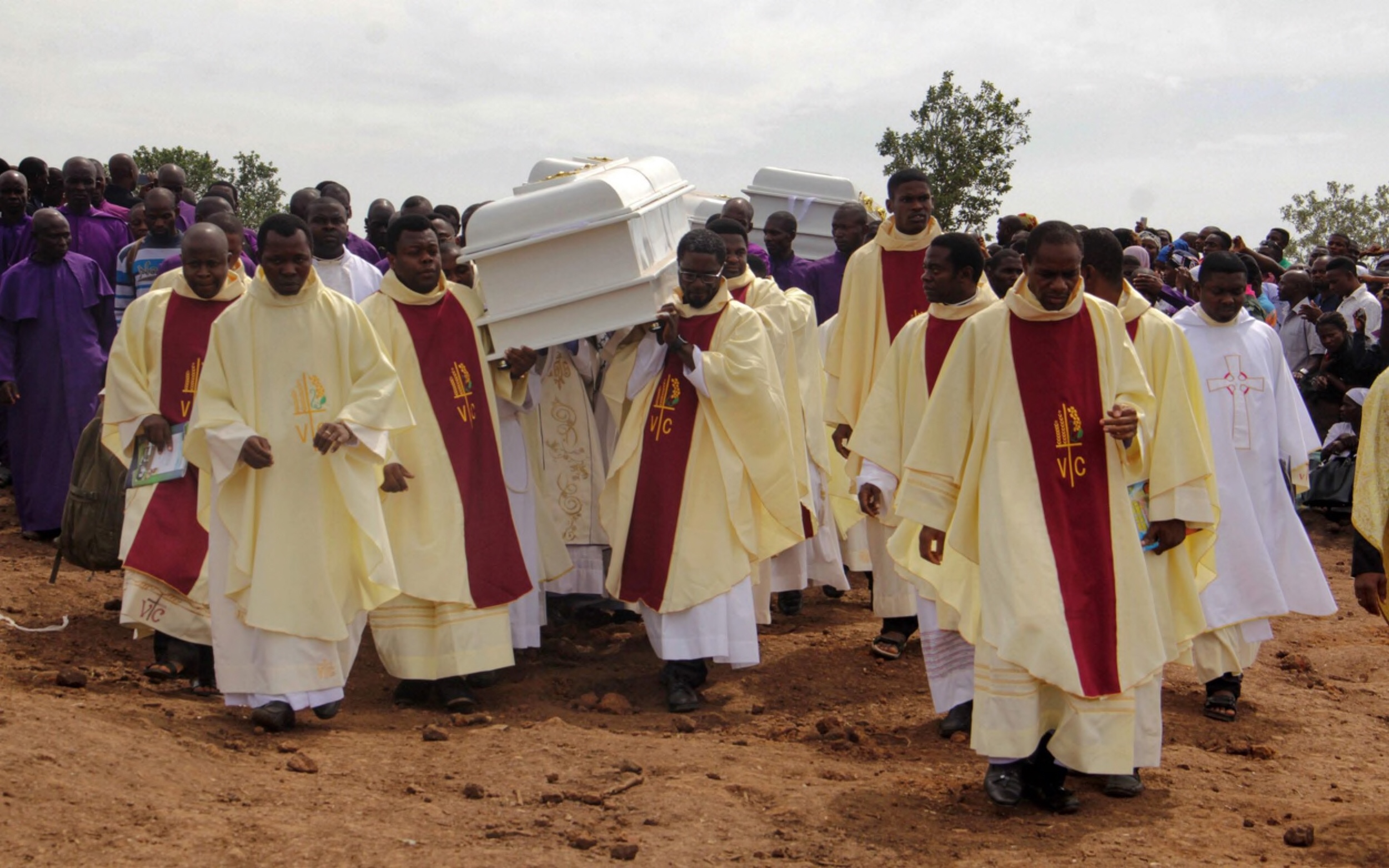 Clergymen carry white coffins containing the bodies of priests allegedly killed by Fulani herdsmen after clashes in May Credit: EMMY IBU/AFP