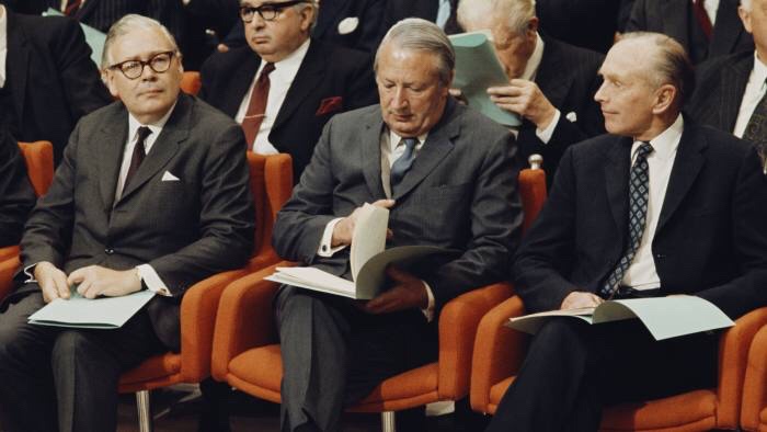 Prime minister Edward Heath, centre, Geoffrey Rippon, left, and Alec Douglas-Home with the European Community accession treaty in 1972 © Getty