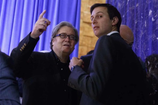 Steve Bannon and Jared Kushner on 11 January 2017. Photograph: Evan Vucci/AP