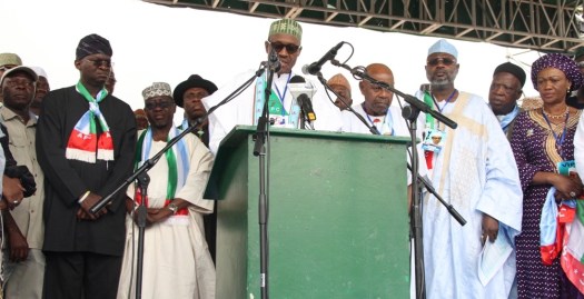 David-West on stage during Buhari’s presidential bid declaration in Abuja in 2014