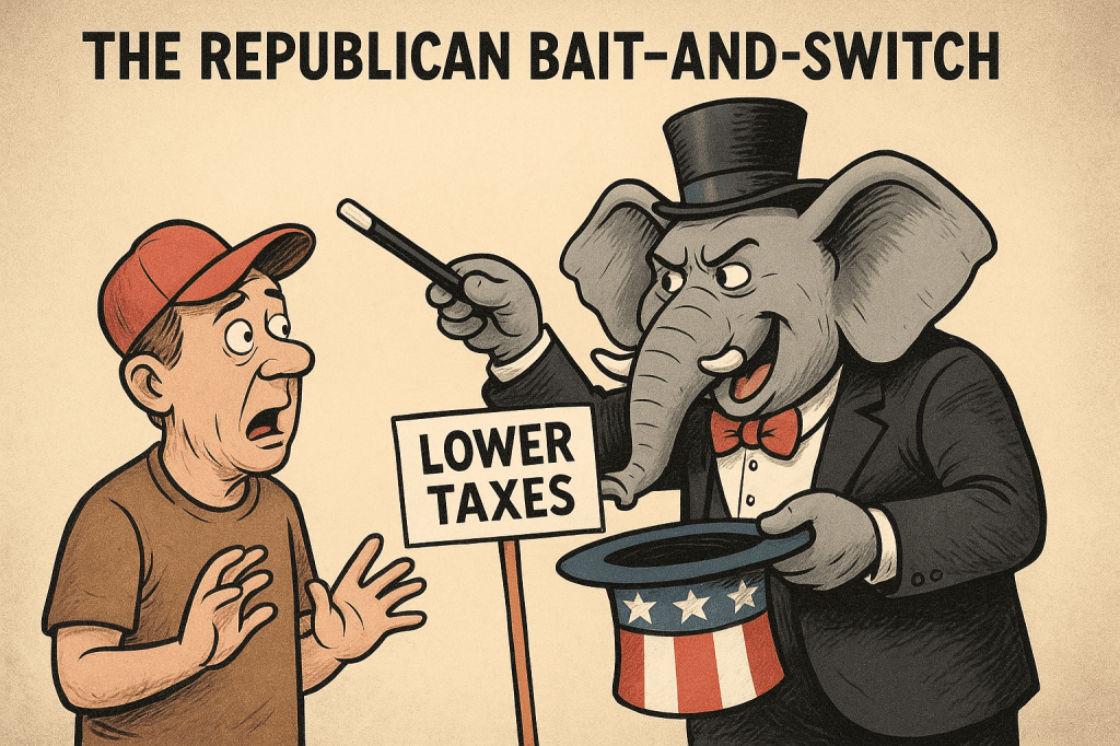 For decades now, the GOP has mastered the art of political ventriloquism — speaking in the voice of the “common man” while their other hand signs tax breaks for billionaires. Every election cycle, they dust off the same script: “We’re fighting for you — the real Americans!” And every time, “you” somehow end up footing the bill for another corporate tax cut, or losing healthcare coverage in the name of “freedom.”
