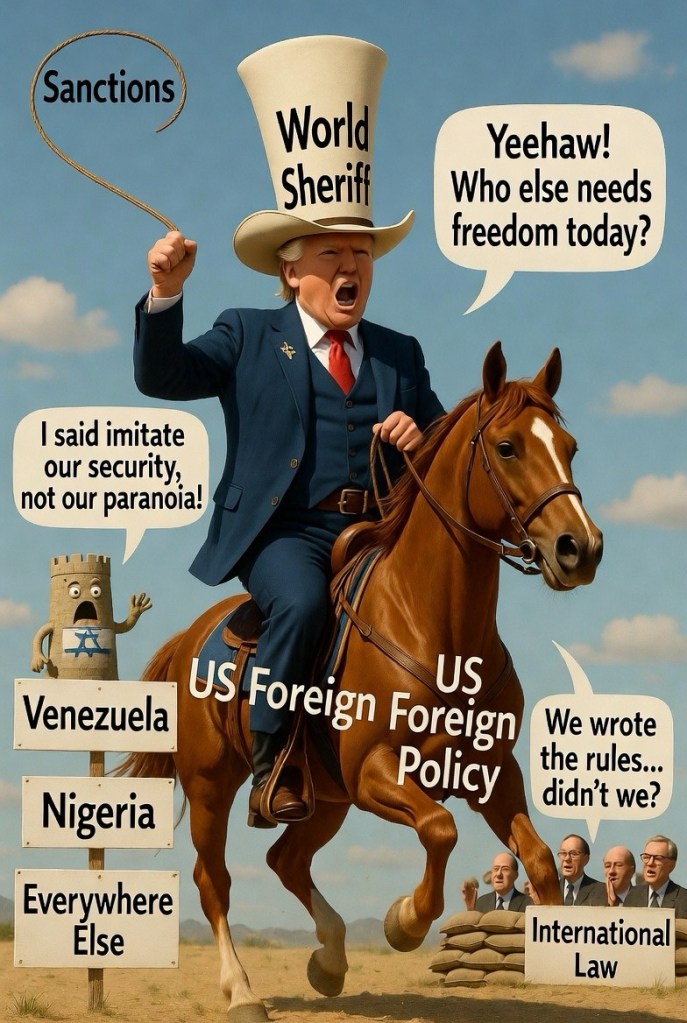 But here’s the plot twist: Israel does this because it genuinely feels existentially threatened. The US does it because… well, because it can. And because certain leaders fancy themselves global sheriffs patrolling the hemisphere for their personal highlight reel.