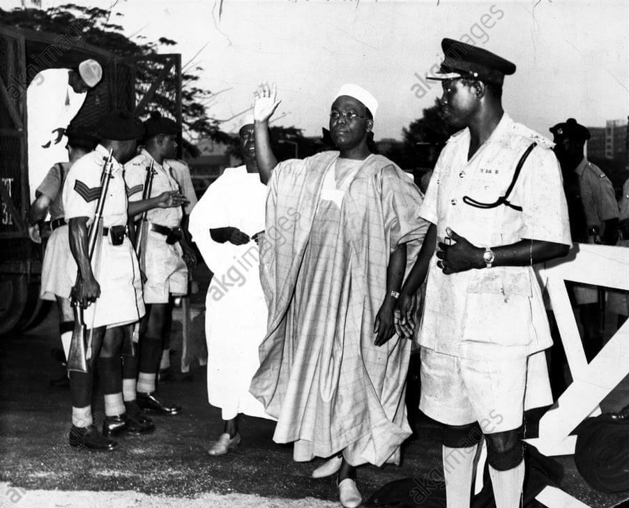 - ” February 1963 – Awolowo Is Charged With Treason – Chief Obafemi Awolowo first Premier of the Western Region between 1954–59, Leader of the Action Group and leader of the opposition in the federal parliament, general secretary of the Egbe Omo Oduduwa since 1948. Formerly Secretary of various unions and co-founder of the Trade Union Congress of Nigeria. Publications include Path to Nigerian Freedom, an autobiography entitled Awo, and numerous political booklets. The trial of Chief Awolowo and 24 others began with high drama. (Photograph by Matthew Faji Photographer ©BAHA) – AKG Images AKG2475427