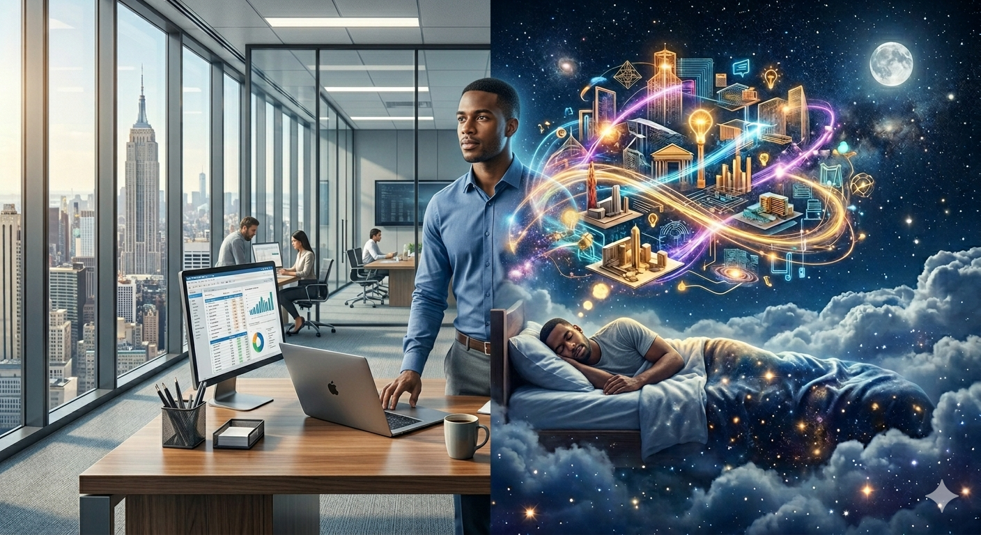 Awake actions and sleeping thinking, in fact one is most productive during one’s being. Any production is at its most and it’s all times.