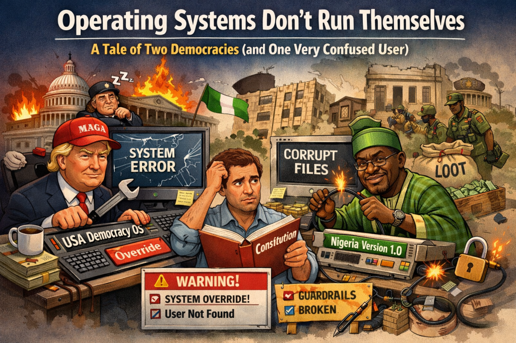 If the US is Windows 98, Nigeria is that laptop you bought in Computer Village where the seller swore, “Everything is installed,” but forgot to mention the system has no security updates and one mysterious folder called “Do Not Open.”